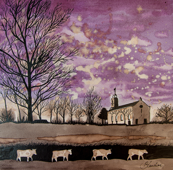 Landscape inspired by the spectacular sunset in the Dutch village Simonshaven. This vinorel is made with the wine of vineyard “de vier ambacht” in Simonshaven where I will expose on 29th en 30th of june for the art week-end. Everybody welcome! Please check at http://agthuysen-wijnbouw.nl/pagina21.html