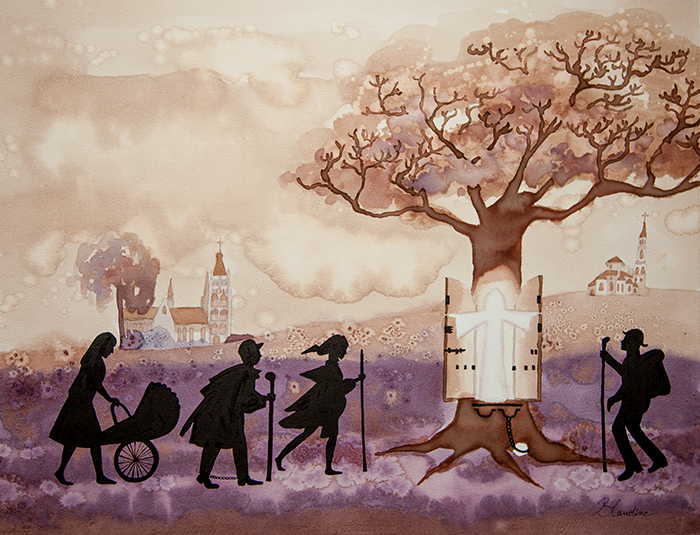 The story of Ledenaert, Leonard in French, painted with French and Dutch wines. You can see this vinorel (painting with wine) in the Ledevaert church in Chaam (near Breda, the Netherlands). On the church’s bell you can read ” Ledevaert” . According recent research it was a mistake, you must read ” Ledenaert” who refers to Saint Leonard, a holly man who lived in France in the Middel Ages. Saint Leonard was known to have delivered prisoners and helped women to give birth. In Saint Leonard de Noblat (France) you can find his abdey and in Chaam a church wears his name. This vinorel and other ones are exposed in the summer 2013 in the Ledevaert church and Sint Antonius church in Chaam for ” rondje open kerk”. More details on: http://www.rondjeopenkerk.nl and http://www.ledevaertkerk.nl